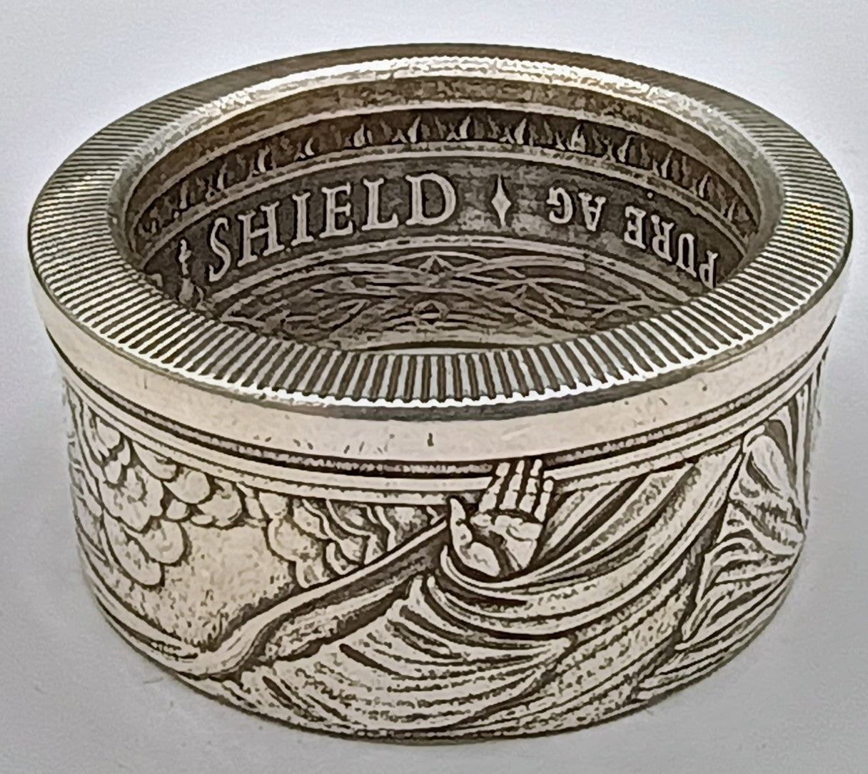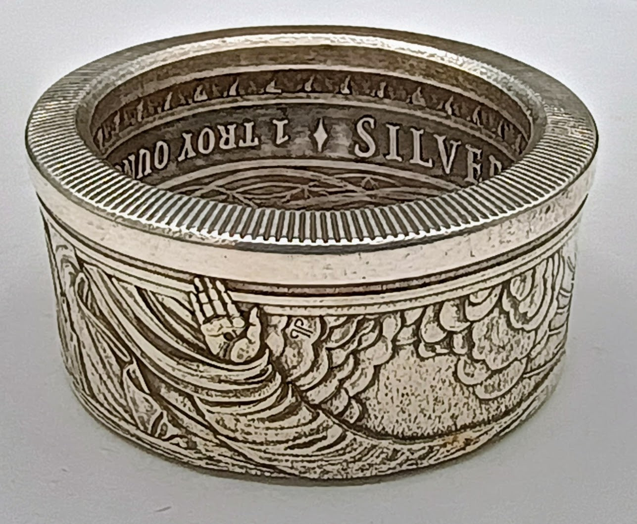 This Beefy ring is crafted from a .999 pure silver , 1 Troy ounce round. After crafting it still weighs 28.5 grams. This is a ring you can feel when you wear it.